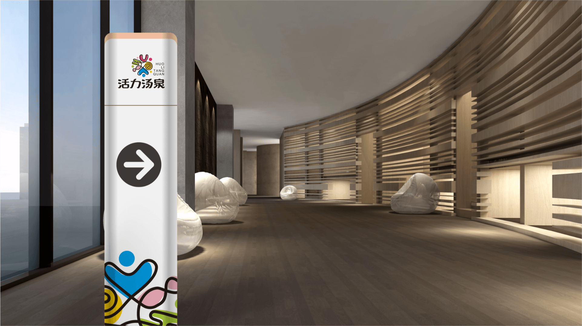 在 VI 應(yīng)用層面,團隊將 “有趣” 與 “輕奢” 的基因貫穿到每一個細(xì)節(jié):店內(nèi)導(dǎo)視系統(tǒng)采用柔和的馬卡龍色搭配簡約圖標(biāo),既清晰易懂,又符合 ins 美學(xué),讓消費者在尋找區(qū)域時也能感受到品牌的精致;宣傳物料以 “場景化” 為主,海報上展示年輕人在電影房大笑、在休息區(qū)拍照的畫面,配文 “來活力湯泉,玩出趣”,讓 “真有趣” 不再是抽象概念,而是可想象的真實體驗;甚至連餐具、毛巾等周邊物品,都印有小巧的 “歡聚” 標(biāo)識,讓品牌形象滲透到消費者體驗的每一個環(huán)節(jié),強化品牌記憶。